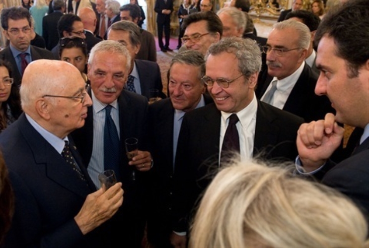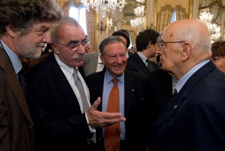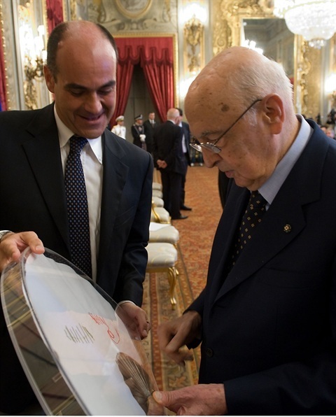 Il Presidente Giorgio Napolitano riceve il tradizionale "Ventaglio" da Pierluca Terzulli, Presidente dell'Associazione Stampa Parlamentare