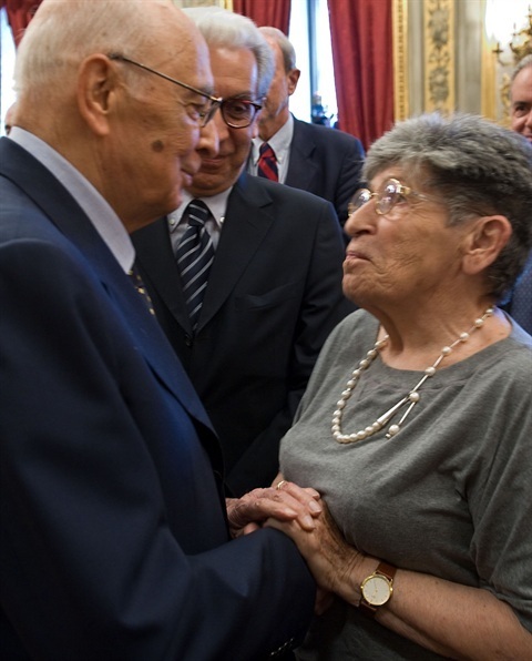 Il Presidente Giorgio Napolitano saluta Miriam Mafai, al termine dell'incontro con i componenenti dell'Associazione Stampa Parlamentare