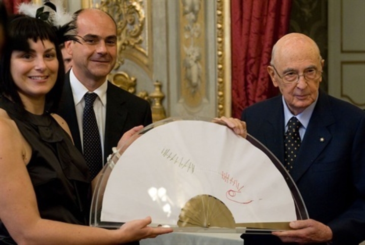 Il Presidente Giorgio Napolitano riceve il tradizionale "Ventaglio" da Pierluca Terzulli, Presidente dell'Associazione Stampa Parlamentare e dall'autrice del ventaglio Monica Pezzoli, dell'Accademia delle Belle Arti di Roma