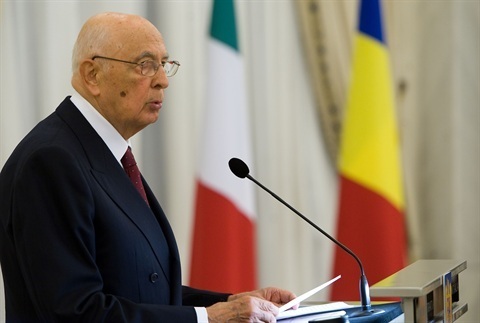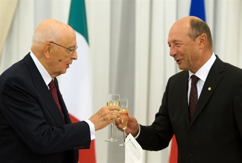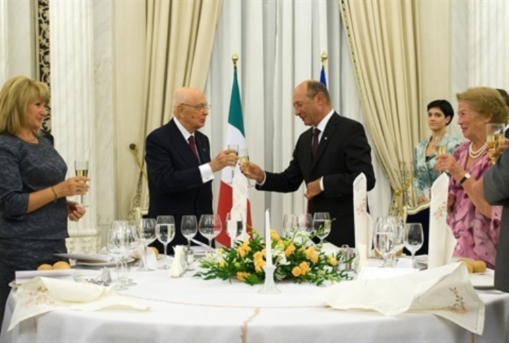 Il Presidente Giorgio Napolitano e il Presidente di Romania Traian Basescu con le rispettive consorti, in occasione del brindisi al pranzo di Stato