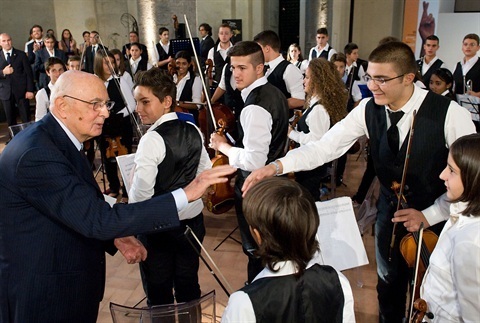 Il Presidente Giorgio Napolitano saluta i ragazzi dell'Orchestra Giovanile "Sanitansamble"