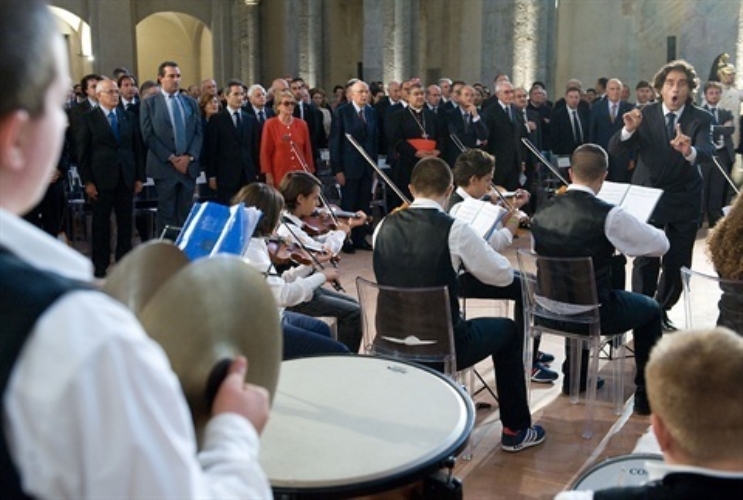 Il Presidente Giorgio Napolitano durante dell'Inno d'Italia eseguito dall'Orchestra Giovanile "Sanitansamble", al termine dell'incontro sul tema "Cinque anni con il Sud"