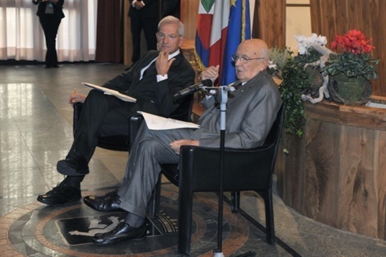 Il Presidente Giorgio Napolitano, con Luciano Violante, Presidente di Italiadecide, nel corso dell'incontro "Scuola per la Democrazia"