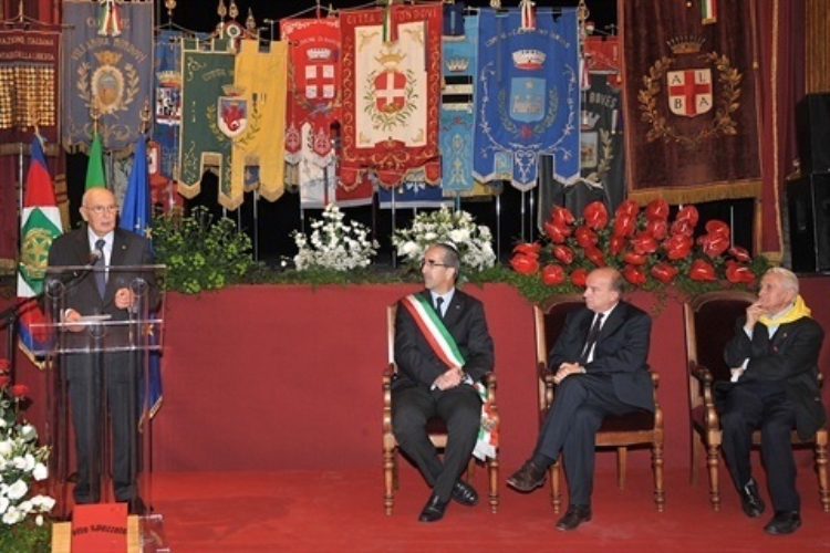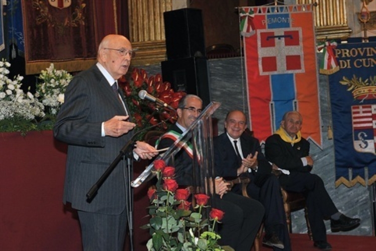 Il Presidente Giorgio Napolitano durante il suo intervento in occasione dell'incontro sul tema "Cuneo e l'Unità d'Italia" al Teatro Toselli