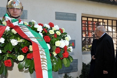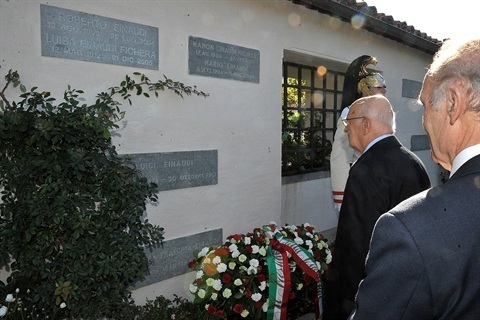Il Presidente Giorgio Napolitano nel corso della deposizione di un cuscino di fiori sulla tomba del Presidente Luigi Einaudi