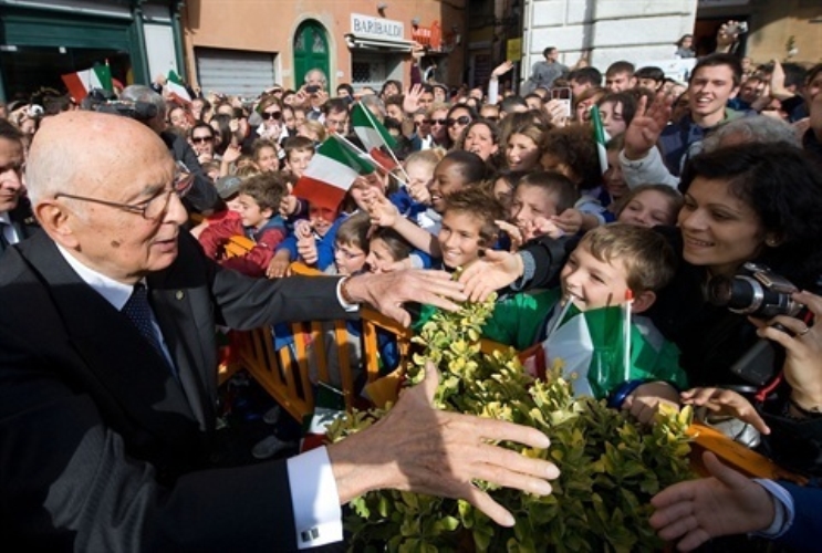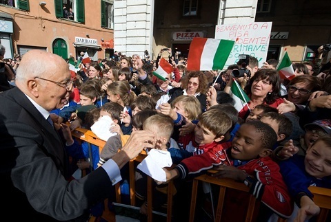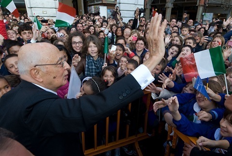Il Presidente Giorgio Napolitano risponde al saluto dei cittadini in Piazza Garibaldi