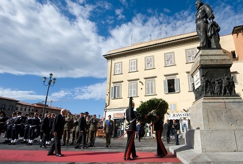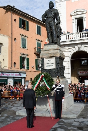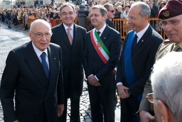 Il Presidente Giorgio Napolitano, con il Rettore dell'Università di Pisa Massimo Mario Augello, dinanzi al monumento in ricordo degli studenti caduti nella battaglia di Curtatone e Montanara