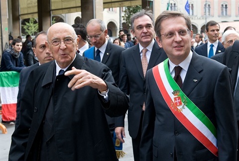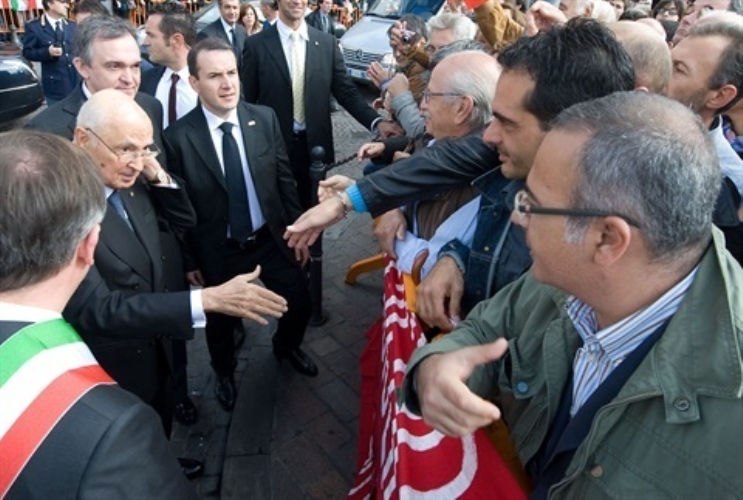Il Presidente Giorgio Napolitano risponde al saluto dei cittadini presenti in Piazza Garibaldi