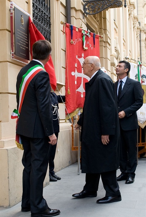 Il Presidente Giorgio Napolitano, con a fianco il Sindaco di Pisa Marco Filippeschi, scopre una targa commemorativa dell'avvenuto restauro di Corso Italia