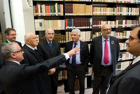 Il Presidente Giorgio Napolitano, accompagnato dal cons. Paolo Peluffo, Consulente per le celebrazioni del 150° dell'Unità d'Italia, visita la biblioteca della Domus Mazziniana