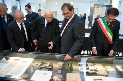 Il Presidente Giorgio Napolitano osserva il Passaporto inglese usato da Giuseppe Mazzini, nel corso della visita alla restaurata Domus Mazziniana
