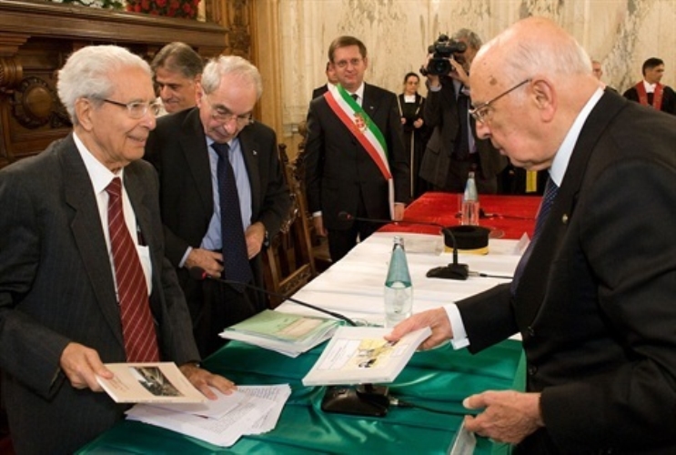 Il Presidente Giorgio Napolitano con il prof. Salvo Mastellone, il Rettore Massimo Mario Augello, il Presidente del Comitato per il 150° anniversario dell'Unità d'Italia, Giuliano Amato, e il Sindaco il Pisa Marco Filippeschi,