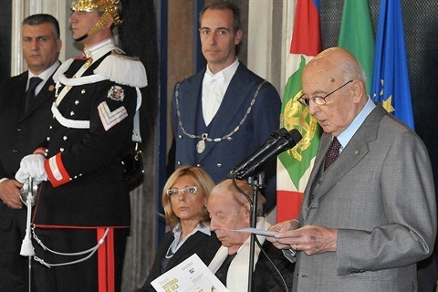 Il Presidente Giorgio Napolitano rivolge il suo indirizzo di saluto agli Artisti, in occasione della cerimonia al Quirinale della Giornata dello Spettacolo