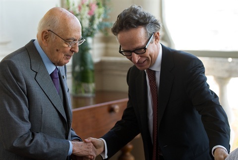 Il Presidente Giorgio Napolitano accolto da alcuni ragazzi al suo arrivo a Villa Lante al Gianicolo, in occasione dell'intervento al convegno "Il Risorgimento nella formazione degli Stati nazionali - Italia e Finlandia"