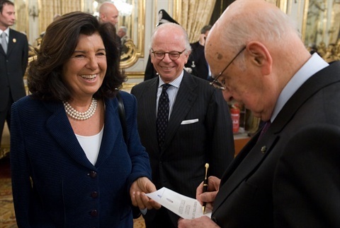 Il Presidente Giorgio Napolitano autografa il cartoncino d'invito alla neo Ministro della Giustizia Paola Severino