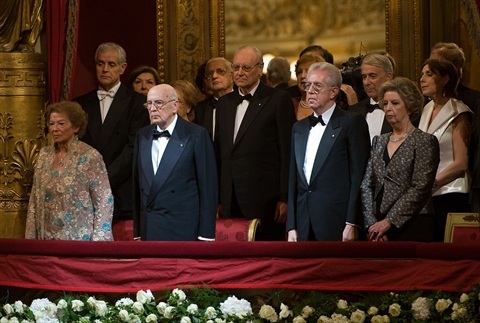 Il Presidente della Repubblica Giorgio Napolitano con il Presidente del Consiglio Mario Monti e le rispettive consorti al Teatro alla Scala, in occasione dell'inaugurazione della stagione d'opera e balletto 2011/2012 con l'opera "Don Giovanni" di Wolfang Amadeus Mozart, eseguita dall'Orchestra e dal Coro del Teatro alla Scala, diretti dal Maestro Daniel Barenboim