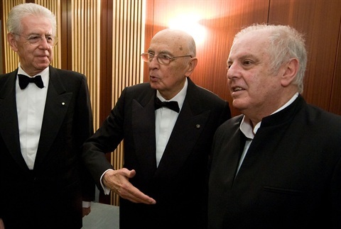 Il Presidente Giorgio Napolitano e il Presidente del Consiglio Mario Monti con il Maestro Daniel Barenboim, al termine del I atto del "Don Giovanni"