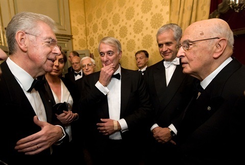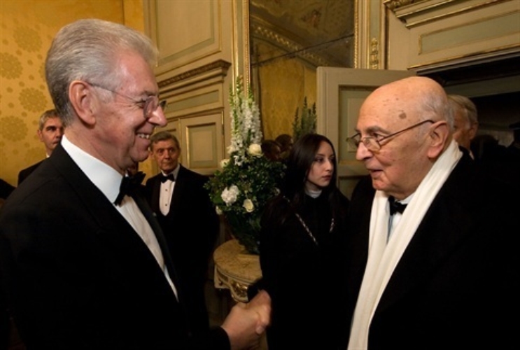 Il Presidente Giorgio Napolitano con il Presidente del Consiglio Mario Monti al Teatro alla Scala, in occasione dell'inaugurazione della stagione d'opera e balletto 2011/2012 con l'opera "Don Giovanni" di Wolfang Amadeus Mozart, eseguita dall'Orchestra e dal Coro del Teatro alla Scala, diretti dal Maestro Daniel Barenboim