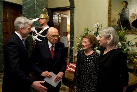Il Presidente Giorgio Napolitano con l'Ambasciatore del Regno Unito di Gran Bretagna e Irlanda del Nord Christopher Prentice e le rispettive consorti, in occasione dell'incontro per il 60° anniversario dell'incoronazione di S.M. Elisabetta II