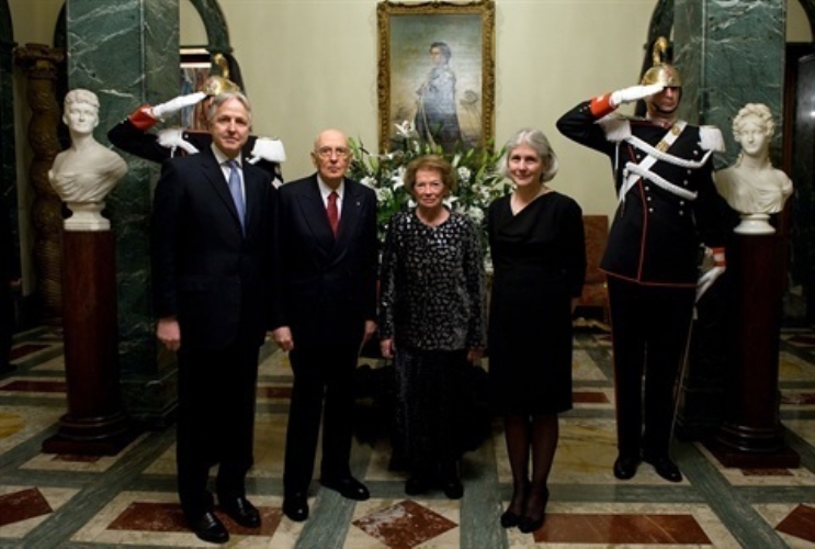 Il Presidente Giorgio Napolitano con l'Ambasciatore del Regno Unito di Gran Bretagna e Irlanda del Nord Christopher Prentice e le rispettive consorti, in occasione dell'incontro per il 60° anniversario dell'incoronazione di S.M. Elisabetta II