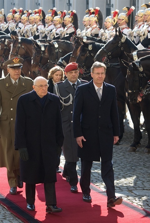 Il Presidente Giorgio Napolitano con il Presidente della Repubblica Federale di Germania Christian Wulff, passano in rassegna un picchetto d'onore del Reggimento Corazzieri, in occasione della visita di Stato in Italia