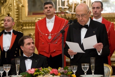 Il Presidente Giorgio Napolitano, con a fianco il Presidente della Repubblica di Malta George Abela, rivolge il suo indirizzo di saluto in occasione del pranzo di Stato