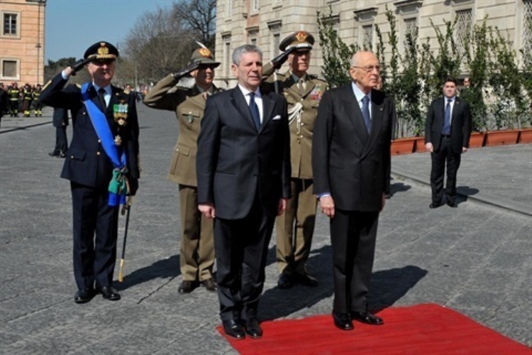 Il Presidente Giorgio Napolitano con il Ministro della Difesa, Giampaolo Di Paola, durante gli onori militari passa in rassegna il Reparto d'Onore schierato con Bandiera e Banda in occasione della celebrazione del 89° anniversario di fondazione dell'Aeronautica Militare