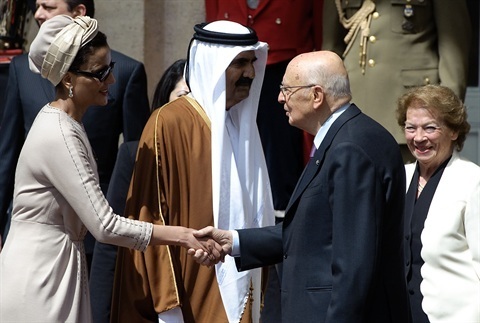 Il Presidente Giorgio Napolitano con l'Emiro dello Stato del Qatar. S.A. lo Sceicco Hamad Bin Khalifa Al-Thani e le rispettive consorti in occasione del congedo al termine della visita di Stato