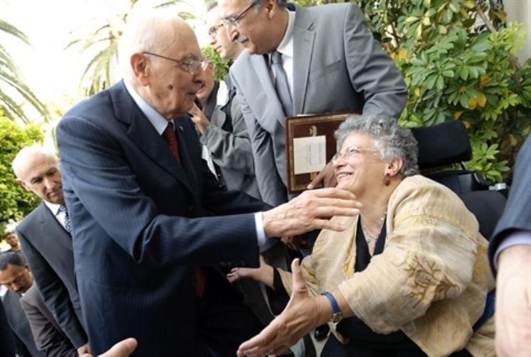 Il Presidente Giorgio Napolitano in occasione della visita alla mostra di Maurizio Valenzi saluta la figlia Lucia
