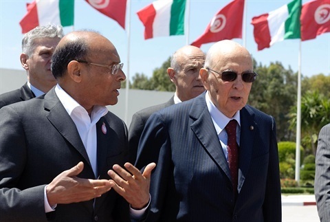 Il Presidente Giorgio Napolitano accolto al suo arrivo all'aeroporto di Tunisi dal Presidente della Repubblica Tunisina Moncef Marzouki