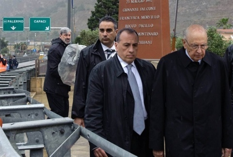 Il Presidente Giorgio Napolitano nei pressi di Capaci dopo il minuto di raccoglimento davanti alla stele in ricordo delle vittime della strage