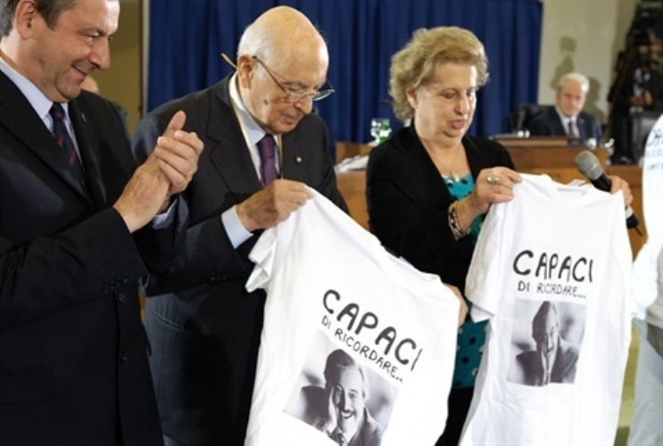 Il Presidente Giorgio Napolitano con il Ministro dell'Istruzione Francesco Profumo e il Presidente della Fondazione "Giovanni e Francesca Falcone" Maria Falcone, durante la cerimonia commemorativa del Giudice, nel ventennale dell'assasinio