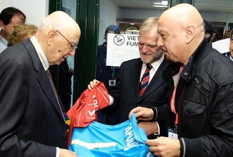 Il Presidente Giorgio Napolitano riceve le maglie delle Nazionali di Calcio Magistrati e Attori dal Giudice Piero Calabrò e Enrico Ruggeri, capitani delle rispettive nazionali