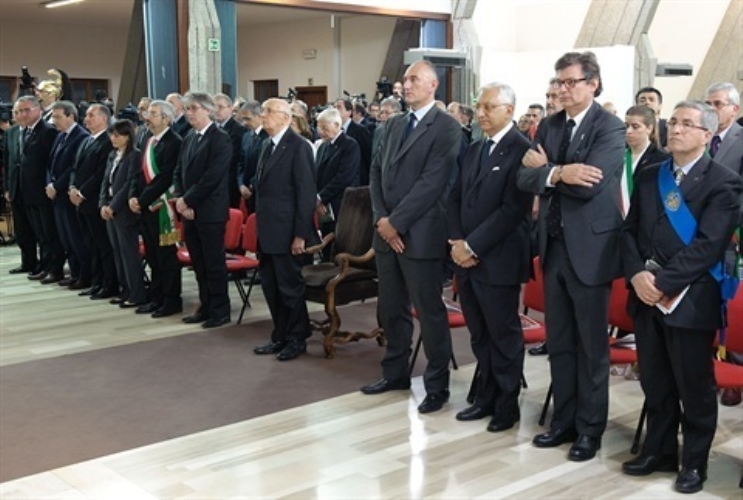 Il Presidente Giorgio Napolitano e le Autorità presenti ossevano un minuto di silenzio in memoria delle vittime del terremoto in Emilia