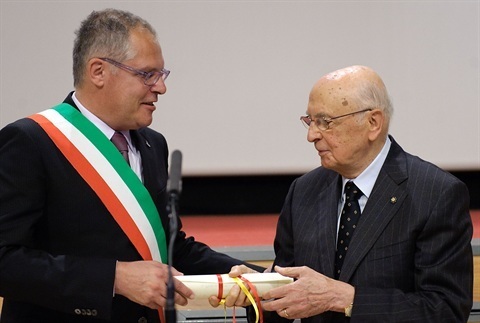 Il Presidente Giorgio Napolitano riceve dal Sindaco di Gemona Paolo Urbani la pergamena della cittadinanza onoraria, nel corso della celebrazione del 36° anniversario del terremoto del 6 maggio del 1976