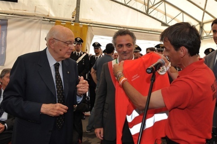 Il Presidente Giorgio Napolitano riceve in dono una maglietta in occasione della visita nelle zone terremotate dell'Emilia Romagna