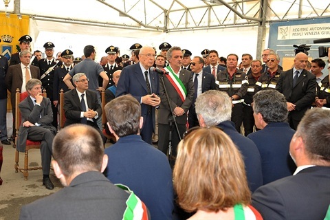 Il Presidente Giorgio Napolitano durante il suo intervento in occasione della visita nelle zone terremotate dell'Emilia Romagna