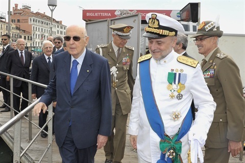 Il Presidente Giorgio Napolitano con il Capo di Stato Maggiore della Marina Militare Amm. Sq. Luigi Binelli Mantelli durante l'imbarco sulla Nave Argo
