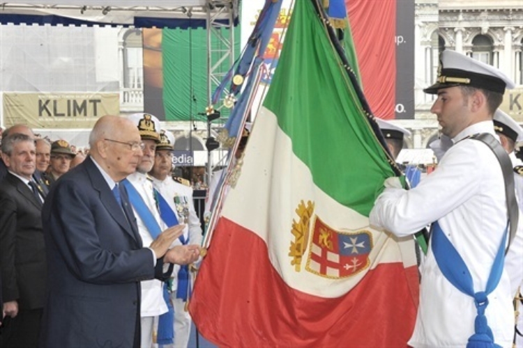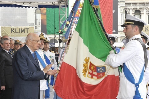 Il Presidente Giorgio Napolitano plaude dopo la consegna della Croce di "Cavaliere" dell'Ordine Militare d'Italia alla Bandiera di Guerra in occasione della celebrazione del 94° anniversario di fondazione della Marina Militare