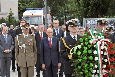 Il Presidente Giorgio Napolitano durante la deposizione di una corona di fiori ai cantieri navali di Danzica in occasione della visita di Stato nella Repubblica di Polonia