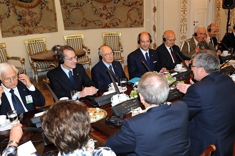Il Presidente Giorgio Napolitano con il Presidente della Repubblica di Polonia durante i colloqui allargati alle delegazioni ufficiali