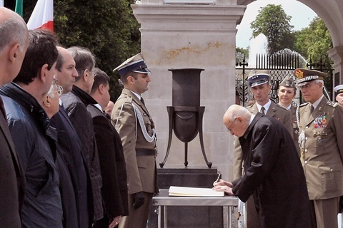 Il Presidente Giorgio Napolitano durante la firma del libro d'onore al Sacello del Milite Ignoto in occasione della visita di Stato nella Repubblica di Polonia