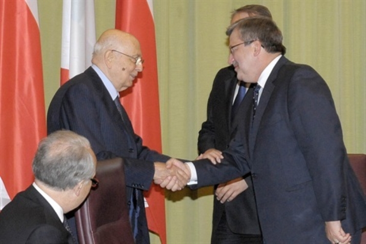 Il Presidente Giorgio Napolitano al termine del suo intervento al Forum di imprenditori viene salutato dal Presidente della Repubblica di Polonia Bronislaw Komorowski