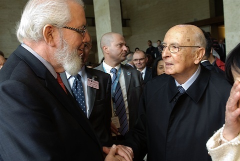 Il Presidente Giorgio Napolitano saluta il Direttore Generale dell'Organizzazione Internazionale del Lavoro Juan Somavìa, al suo arrivo alla Sede dell'OIL