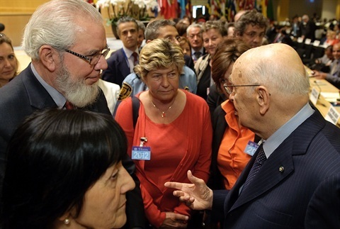 Il Presidente della Repubblica Giorgio Napolitano con il Direttore Generale dell'Organizzazione Internazionale del Lavoro Juan Somavìa e il Segretario della CGIL Susanna Camusso, al termine dell'intervento alla 101^ Conferenza dell'OIL