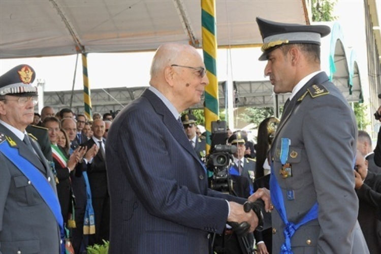 Il Presidente Giorgio Napolitano durante la consegna di una Croce di Bronzo al Merito della Guardia di Finanza al Col. Antonello Maggiore, in occasione del 238° Anniversario di fondazione del Corpo della Guardia di Finanza