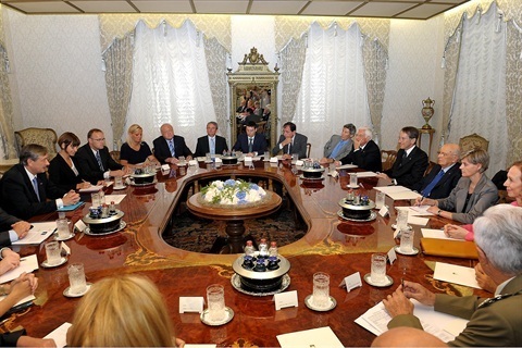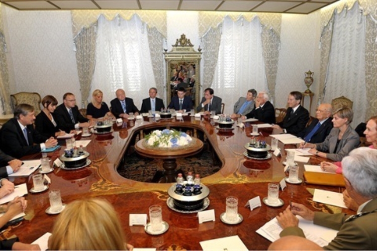 Il Presidente Giorgio Napolitano e il Presidente della Repubblica di Slovenia Danilo Turk durante i colloqui allargati alle delegazioni ufficiali