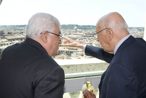 Il Presidente Giorgio Napolitano con il Presidente dell'Autorità Nazionale Palestinese Mahmud Abbas poco prima della colazione offerta al Belvedere del Torrino del Palazzo del Quirinale
