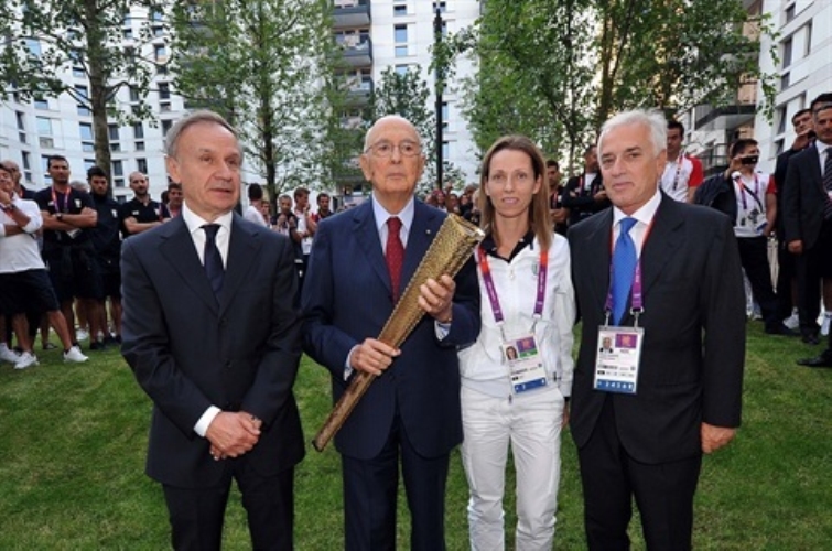 Il Presidente Napolitano riceve la torcia olimpica da Valentina Vezzali, portabandiera della nazionale azzurra