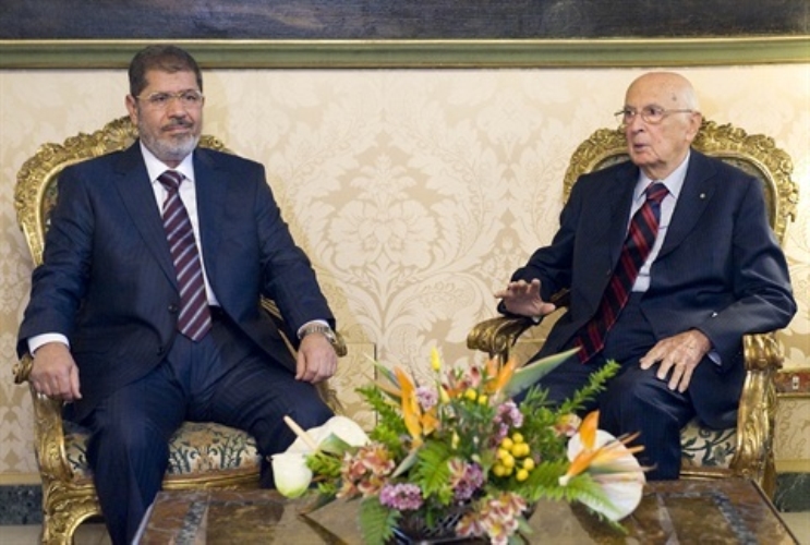 Il Presidente Giorgio Napolitano nel corso dei colloqui con Mohamed Morsi, Presidente della Repubblica Araba d'Egitto